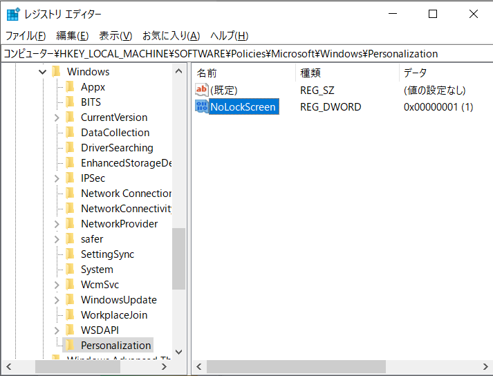 と進み、そこで、Personalization というキーを探します。なければ、Personalization というキー(フォルダ) を作ります。(Windowsの下に)