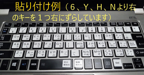 (貼り付け例:2016年式の東芝dynabook R63/Aに貼り付けました。右手キーを1つ右にずらすことによって親指右キーをNキーの左にすることができています)