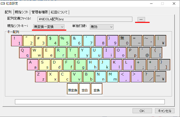 上の(6)の画面で「親指シフト表記付きUSBライトタッチキーボード配列.bnz」を指定する前に、この配列定義ファイルを編集します。