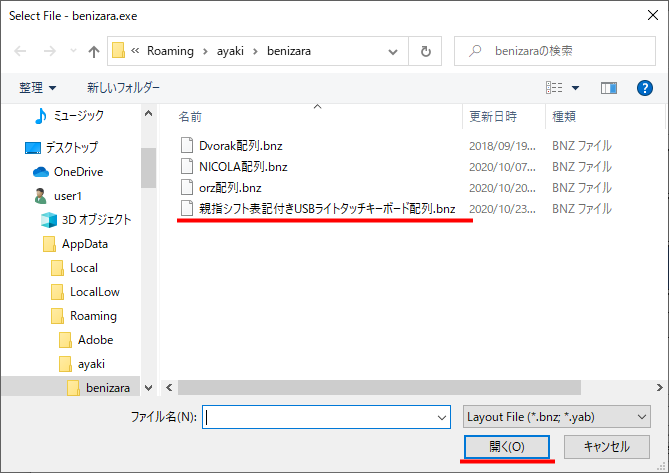 (7)「親指シフト表記付きUSBライトタッチキーボード配列.bnz」を選んで「開く」をクリックします。