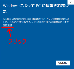 インストールプログラムを実行後にWindows Defender Smartscreenで「WindowsによってPCが保護されました」と出ましたら、「詳細情報」をクリックして、「実行」をクリックすることで、実行することができます。