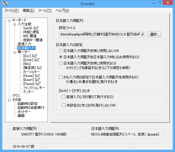 「DvorakJ 親指シフトインストーラー」は、親指シフト用の設定をすぐにできるように当社がインストールプログラムを作成したものです。インストール後すぐに親指シフト(NICOLA)入力ができるように意図しています。このページを公式ページということにします。